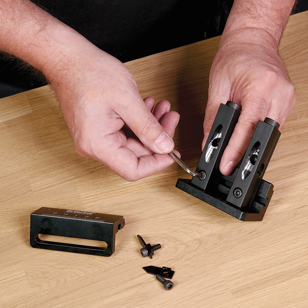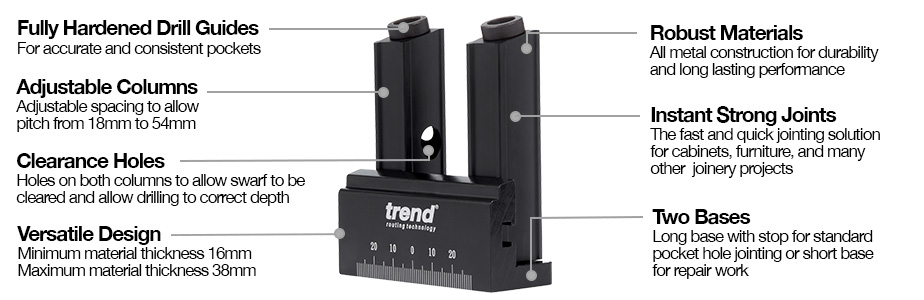 - Fully adjustable from 18mm to 54mm centres for twin holes or stripped down for single pockets; ideal for repairs or joints on thinner components.